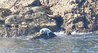 The water was very calm considering we are nestling in the British corner of the Atlantic. The breeze was warm. Seals lazed on the rocks or bobbed their heads out of the water to watch us pass by. It's never entirely certain who is the voyeur! The people holding mobile phones aloft or the water creatures watching us with mild interest!